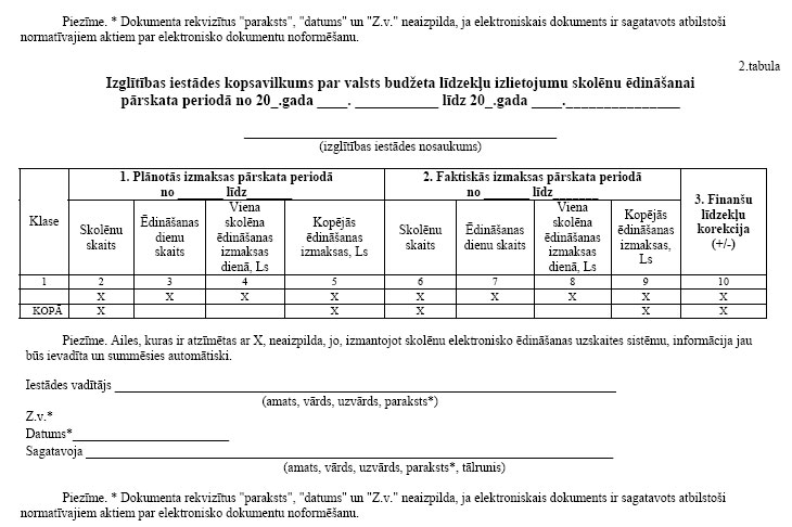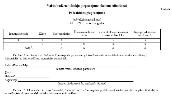 10. Ministrija, ievērojot noteikto valsts budžeta līdzekļu apmēru vienam skolēnam dienā, aprēķina valsts budžeta līdzekļu apmēru katrai pašvaldībai, pamatojoties uz pašvaldības iesniegto valsts budžeta līdzekļu pieprasījumu (2.pielikums) un datiem par skolēnu skaita izmaiņām (3.pielikums).