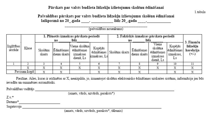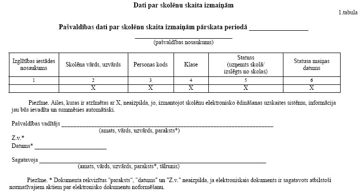 7.3. datus par skolēnu skaita izmaiņām, ja ir mainījies skolēnu skaits, kuru ēdināšanai izlietojami valsts budžeta līdzekļi, – mācību gada laikā katru mēnesi līdz piecpadsmitajam datumam par iepriekšējo mēnesi (3.pielikums 1.tabula).