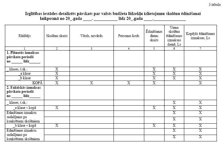 3. Valsts budžeta līdzekļus – 0,80 latu dienā vienam skolēnam – piešķir pašvaldībām pamatizglītības iestādes skolēnu ēdināšanai attiecīgās pašvaldības teritorijā esošajās pamatizglītības iestādēs, kurās skolēni apgūst pamatizglītības programmas, neatkarīgi no izglītības iestādes statusa. Ja pamatizglītības iestādes skolēna ēdināšanas izmaksas pārsniedz minēto apmēru, valsts budžeta līdzekļus izmanto pārtikas produktu iegādei.