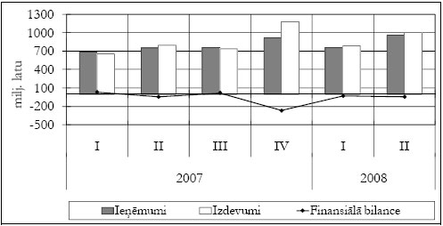 2008.gada pirmajā pusē valsts konsolidētajā budžetā (ieskaitot ziedojumus un dāvinājumus) izveidojās finansiālais pārpalikums 80,8 milj. latu apmērā, tomēr tas ir par 80,6 milj. latu jeb 49,9% mazāk nekā 2007.gada atbilstošajā periodā.