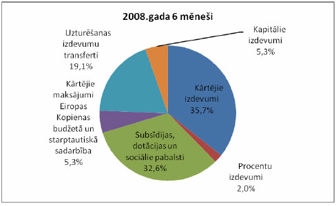 Kopējie izdevumi valsts pamatbudžetā 2008.gada pirmajā pusē tika plānoti 2 099,6 milj. latu apmērā, savukārt faktiskā izpilde bija 1797,2 milj. latu, t.i., par 302,4 milj. latu jeb 14,4% mazāk, nekā plānots. Uzturēšanas izdevumu izpilde valsts pamatbudžetā 2008.gada pirmajā pusē sasniedza 88,3% no pirmās puses plāna, bet kapitālie izdevumi tika apgūti 55,6% apmērā.