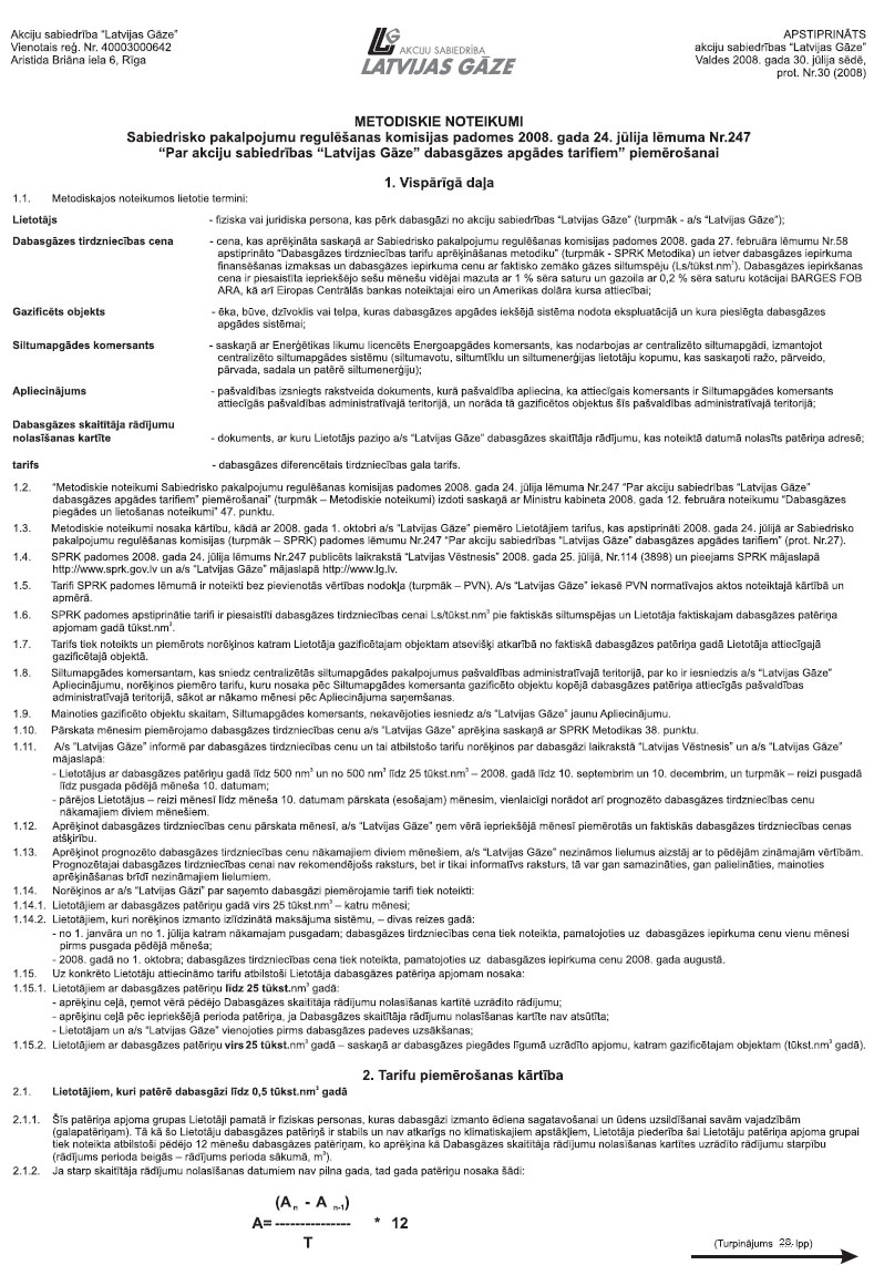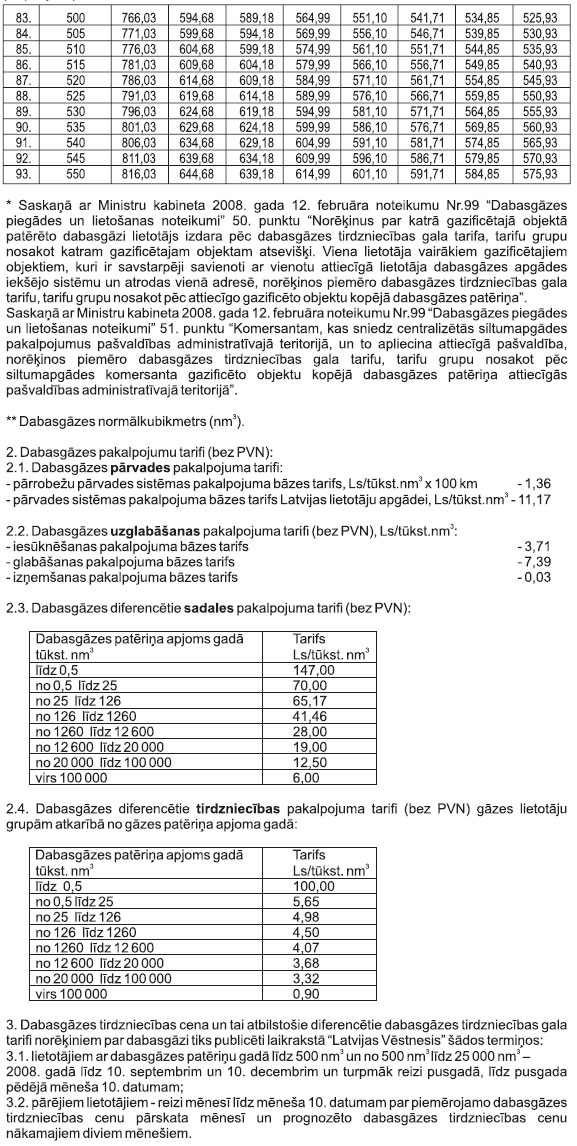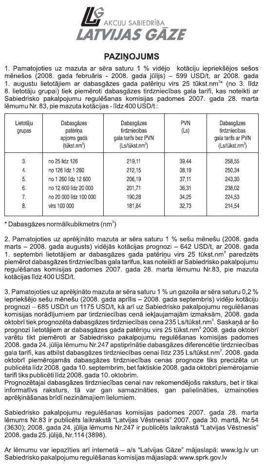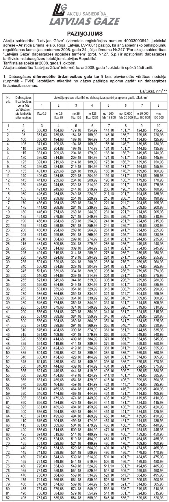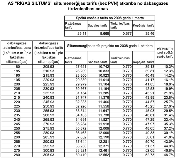 Tarifu izmaiņas ir saistītas ar dabasgāzes cenas pieaugumu, saskaņā ar 2008.gada 24.jūlijā Sabiedrisko pakalpojumu regulēšanas komisijas apstiprinātajiem AS „Latvijas Gāze” dabasgāzes diferencētajiem tirdzniecības gala tarifiem.