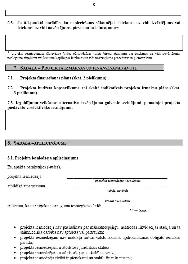 8. Projekta iesniedzēja finansējums ir 15 procentu no projekta kopējām attiecināmajām izmaksām. Projekta iesniedzējs no saviem finanšu līdzekļiem var finansēt vairāk par minimālo noteikto apjomu.