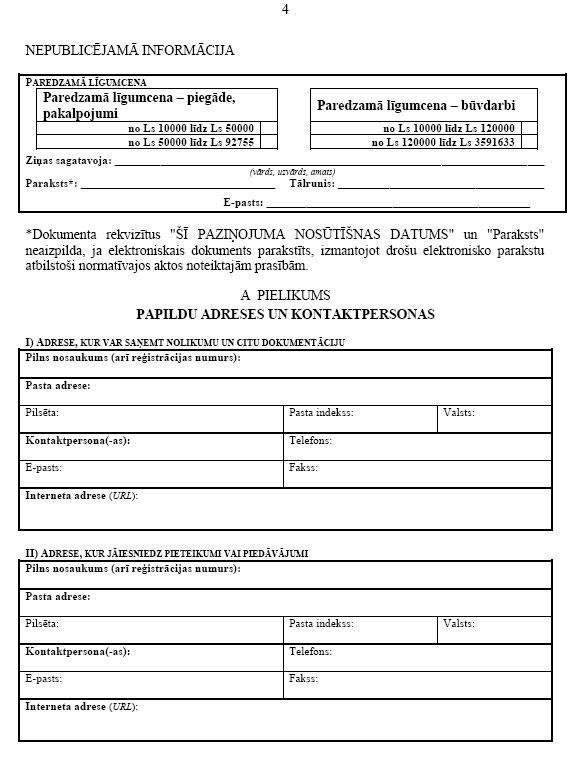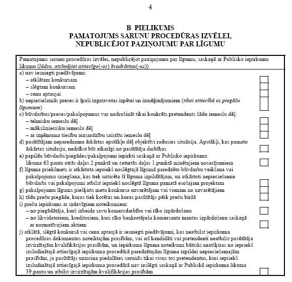 2.4. paziņojums par iepirkuma procedūras rezultātiem (4.pielikums). Šo veidlapu pilnvarota persona aizpilda, piemērojot atklātu konkursu, slēgtu konkursu, cenu aptauju, sarunu procedūru, kā arī dinamisko iepirkumu sistēmu;