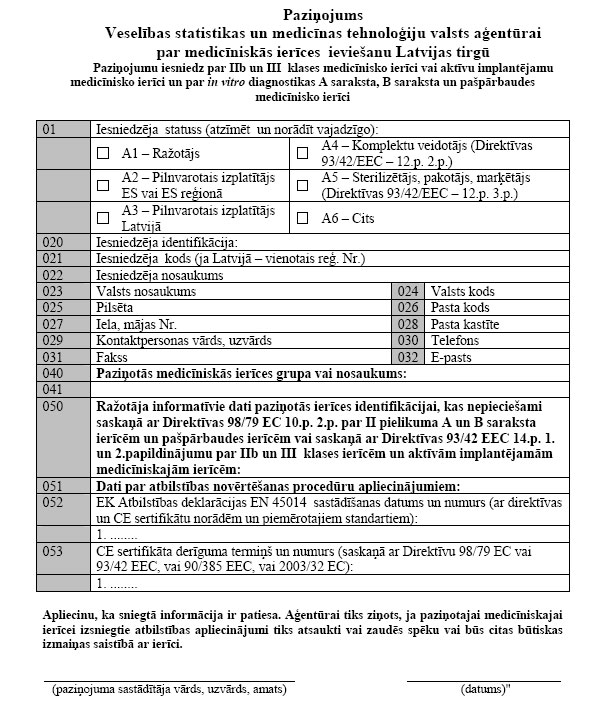 “20.1 Lai I un IIa klases medicīniskās ierīces varētu laist apgrozībā Latvijas Republikas teritorijā, tās marķē ar CE marķējumu. Paziņot par I un IIa klases medicīniskajām ierīcēm nav nepieciešams.”