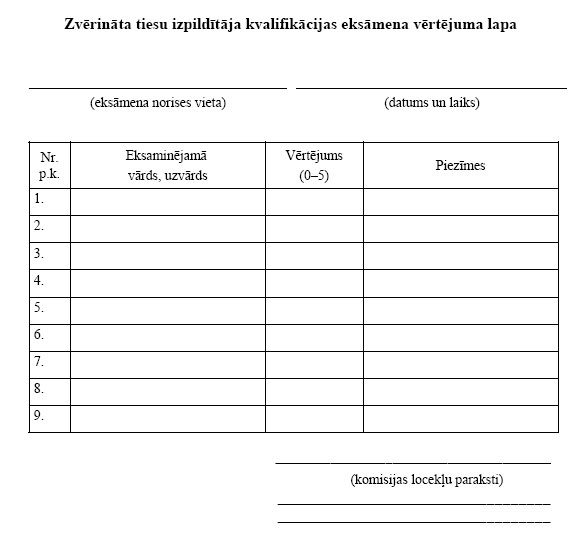 5. Eksāmenu pieņem ar tieslietu ministra rīkojumu apstiprināta eksaminācijas komisija (turpmāk – komisija). Komisijas sastāvā ir komisijas priekšsēdētājs un astoņi komisijas locekļi – Tieslietu ministrijas, tiesu, akadēmiskā personāla un zvērinātu tiesu izpildītāju pārstāvji. Komisijas priekšsēdētājs ir Tieslietu ministrijas pārstāvis. Komisijas sekretāra pienākumus pilda padomes norīkota persona.
