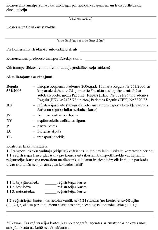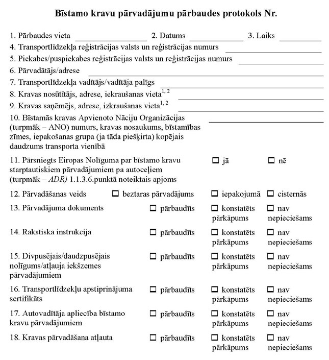 3.3.2.4. bīstamo kravu pārvadājumu noteikumu ievērošanu, par katru pārbaudīto transportlīdzekli sastādot bīstamo kravu autopārvadājumu pārbaudes protokolu trijos eksemplāros (1.pielikums). Protokola pirmo eksemplāru uzglabā kontroles institūcija, kas sastādījusi protokolu, otro eksemplāru izsniedz pārbaudītā transportlīdzekļa vadītājam, trešo eksemplāru nosūta Autotransporta inspekcijai;