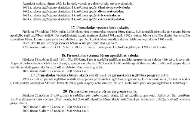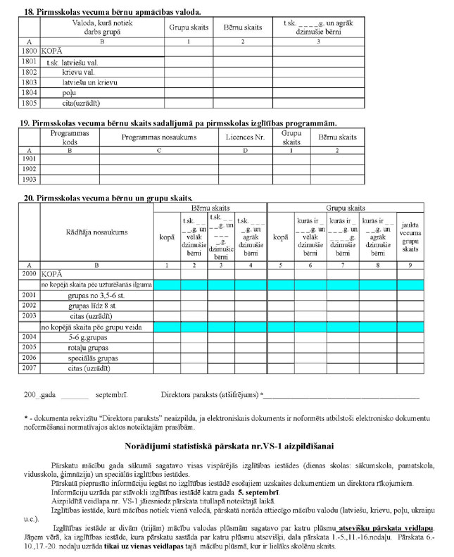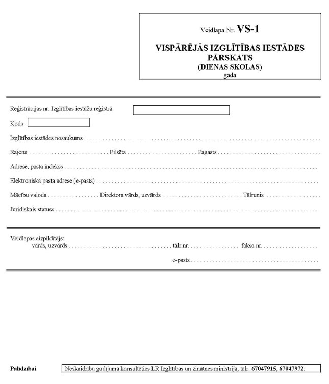 2.1. Vispārējās izglītības iestādes pārskats (dienas skolas) (VS-1) (1.pielikums). Veidlapu aizpilda dienas apmācības vispārējās izglītības iestādes saskaņā ar VS-1 veidlapā minētajiem norādījumiem;