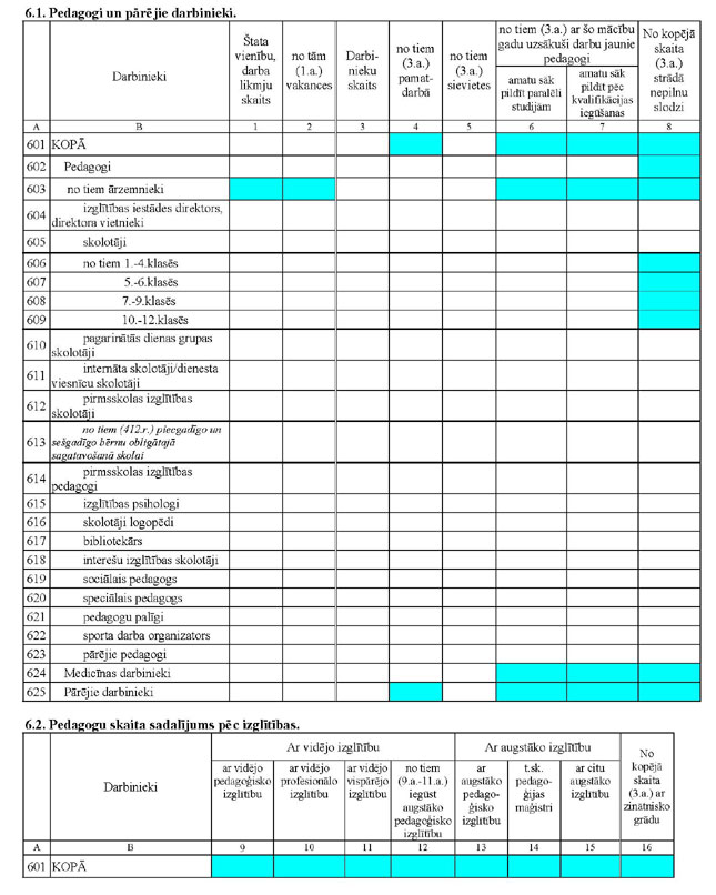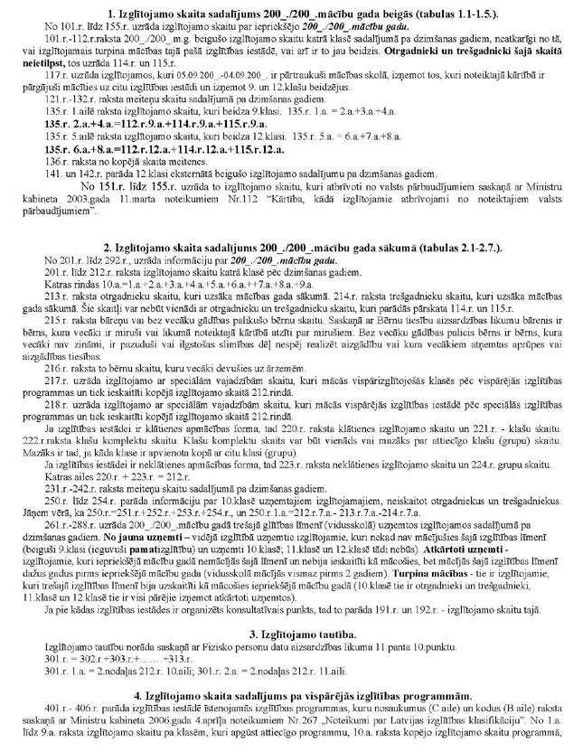 3.1. Vispārējās izglītības iestādes pārskatu (dienas skolas) (VS-1) un Vispārējās izglītības iestādes pārskatu (vakara (maiņu) skolas) (VV-1) – katru gadu ne vēlāk kā 20.septembrī divos eksemplāros izglītības pārvaldē, Izglītības un zinātnes ministrijas padotībā esošās vispārējās izglītības iestādes – Izglītības un zinātnes ministrijā. Izglītības pārvalde līdz 27.septembrim iesniedz datus Izglītības un zinātnes ministrijā. Izglītības un zinātnes ministrija līdz nākamā gada 1.martam iesniedz kopsavilkumu Centrālajā statistikas pārvaldē;