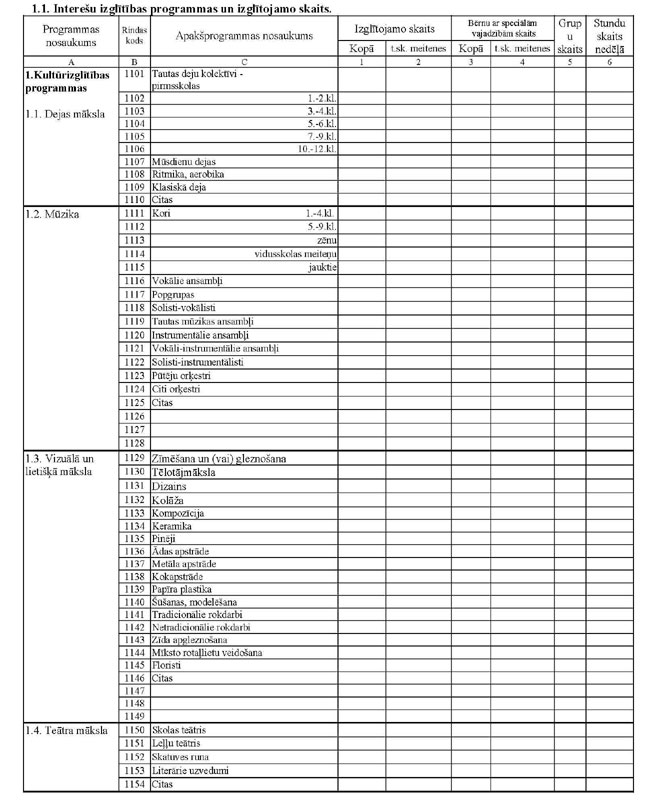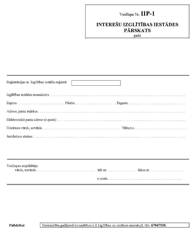 2.3. Interešu izglītības iestādes pārskats (IIP-1) (3.pielikums). Veidlapu aizpilda izglītības iestādes, kuras īsteno interešu izglītības programmas saskaņā ar IIP-1 veidlapā minētajiem norādījumiem;