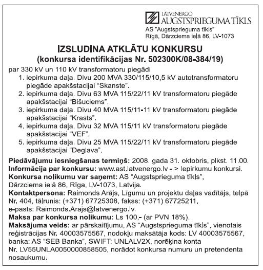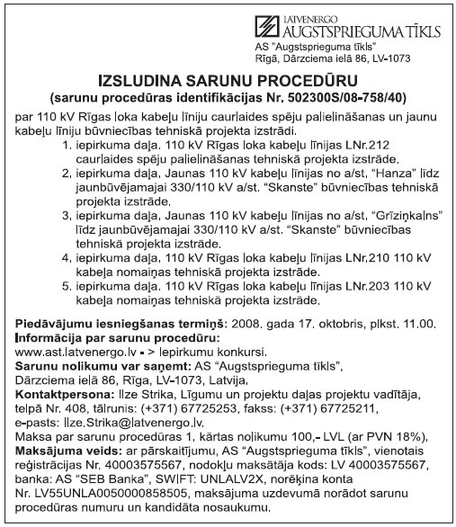 Piedāvājumu iesniegšanas pēdējais termiņš: 2008.gada 26.septembrī plkst. 12.00.