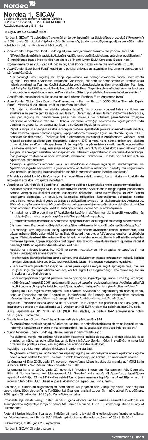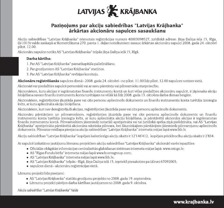 Paziņojumi akcionāriem, dalībniekiem, biedriem. Publicēts oficiālajā laikrakstā "Latvijas Vēstnesis", 23.09.2008., Nr. 147 https://www.vestnesis.lv/ta/id/181436
