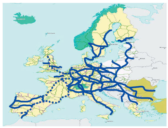 Antverpene-Athus/Bettembourg-Bāzele-Milāna Hallsberg/Mjölby, Zviedrija ETCS uz Oresund savienojuma cauri Dānijai pa Storebelt posmu Āhene – Horka/Frankfurte (O), Vācija Vācija • Kehl-Zalcburga • Flensburga – Kufstein • Emmerich – Bāzele, dažas daļas caur Vāciju • Hamburga – Bad Schandau • Darmštate – Passava Francija • Metz – Dijon – Liona – Aviņjona – Perpignan (Spānijas robeža) • Le Havre – Rouen – Amien – Arras • Parīze – Tours – Bordo – Dax • Parīze – Remis – Metz (TGV EST) • Parīze – Macon – Liona (TGV Sud-Est) • Calais – Metz Stokholma-Nyland-Umea |
