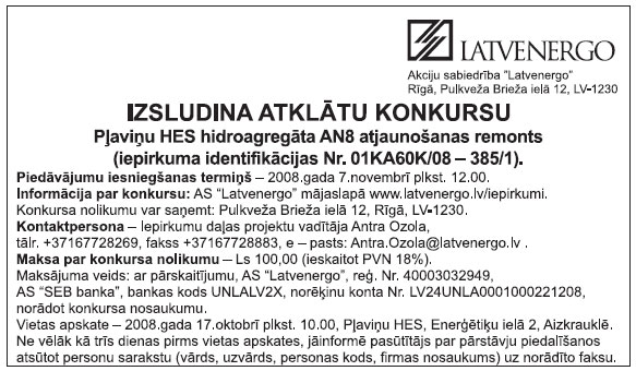 Piedāvājumus var iesniegt līdz 2008.gada 24.novembrim plkst. 14.00. Papildu informācija pa tālr. 64071310.
