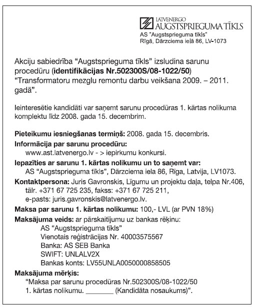 Piegādes un darbu izpildes pasūtījumi. Publicēts oficiālajā laikrakstā "Latvijas Vēstnesis", 7.11.2008., Nr. 174 https://www.vestnesis.lv/ta/id/183474
