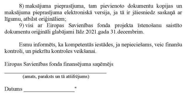 “2. Nodrošinātās darbības, tai skaitā pārbaudes Eiropas Savienības fonda finansējuma saņēmēju līmenī, sniedz pietiekamu apliecinājumu, ka deklarācijā iekļautās summas ir korektas, pieprasītās summas attaisnojuma dokumenti ir pieejami pārbaudei un tiks glabāti normatīvajos aktos par dokumentu glabāšanu noteiktajā kārtībā un faktiski ieturētās summas no nākamā vai kārtējā maksājuma finansējuma saņēmējam ir korektas.” |