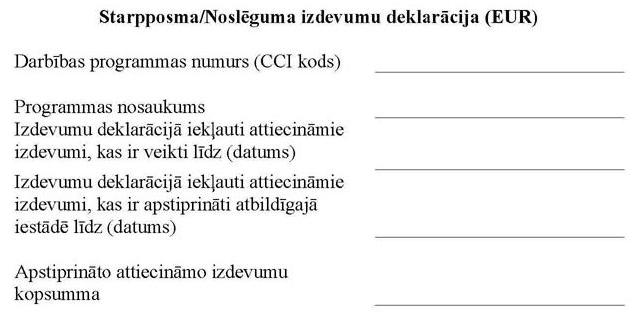 34.1. starpposma izdevumu deklarāciju (6.pielikums), pievienojot aizpildītu apliecinājumu izdevumu deklarācijas apstiprināšanai (7.pielikums), šādos termiņos: