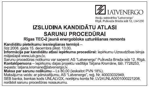 Piedāvājumu dokumentu iesniegšanas termiņš līdz 2008.gada 15. decembrim plkst. 11 Rīgā, Gogoļa ielā 3, 226. telpā.