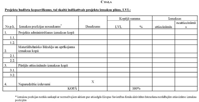 28.4. ja projekta kopējās izmaksas ir vismaz 35 140 200 latu un projekta iesniegums jau sagatavots iesniegšanai Eiropas Komisijā, projekta iesnieguma veidlapa aizpildīta latviešu un angļu valodā. Ja projekta kopējās izmaksas ir mazākas par 35 140 200 latu, projekta iesniegums sagatavots latviešu valodā;
