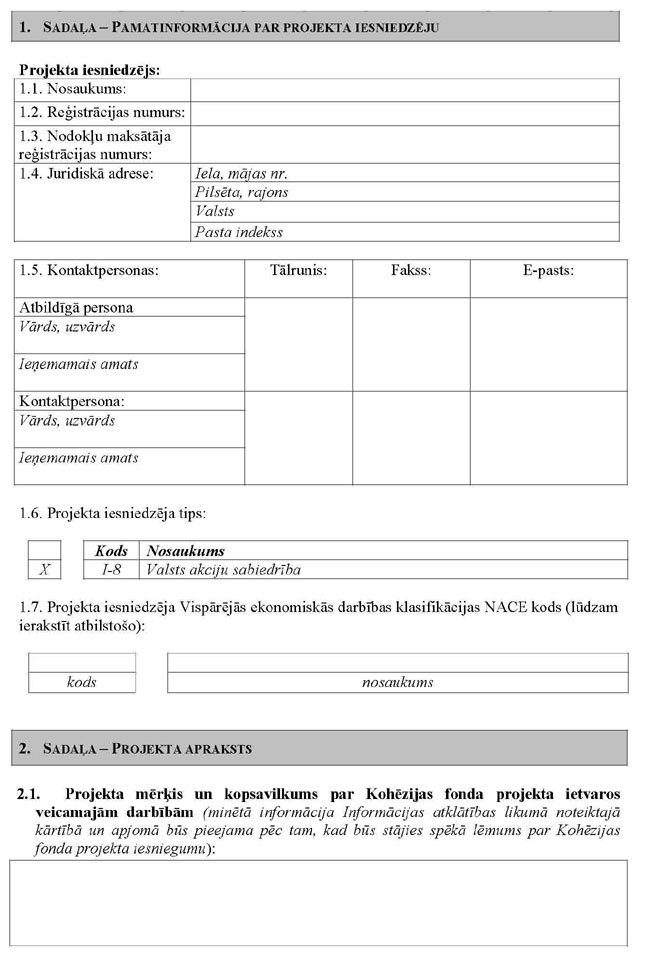 17. Ja projekta kopējās izmaksas ir mazākas par 35 140 200 latu vai projekta kopējās izmaksas ir vismaz 35 140 200 latu, bet projekta iesniegums nav sagatavots iesniegšanai Eiropas Komisijā, projekta iesniegumu sagatavo, aizpildot Kohēzijas fonda projekta iesnieguma veidlapu (2.pielikums).