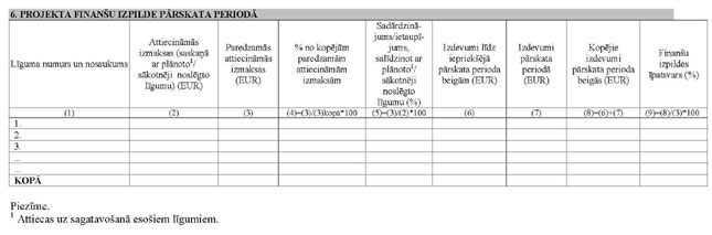 21.6. tabulas 6.ailē “Izdevumi līdz iepriekšējā pārskata perioda beigām (EUR)” norāda līdz iepriekšējā pārskata perioda pēdējam datumam līgumu ietvaros veiktos izdevumus. Norādītajiem datiem jāsakrīt ar iepriekšējā pārskata 5.sadaļas tabulas 8.ailē “Kopējie izdevumi pārskata perioda beigās (EUR)” norādītajiem datiem;