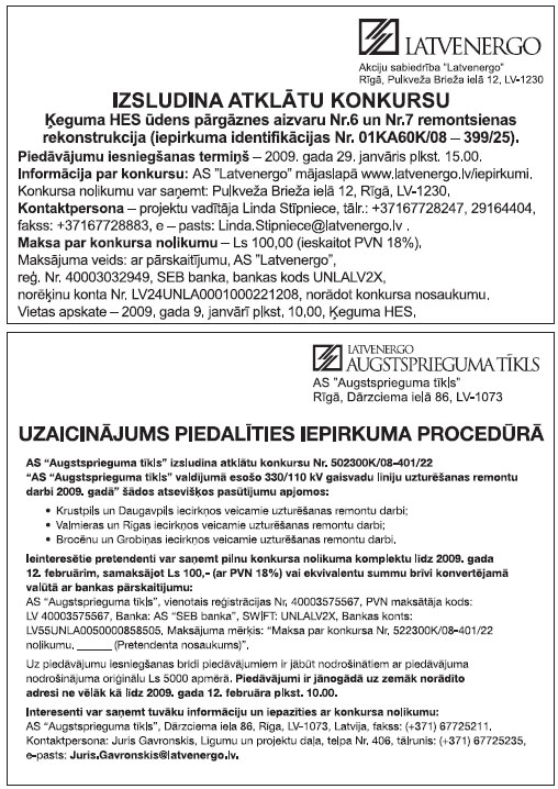 Piedāvājumu iesniegšanas pēdējais termiņš: 2009.gada 23.janvāris plkst. 12. Kontaktpersona: Būvuzraugs T.Čeirāns, tālrunis 67017347, fakss 67017212.