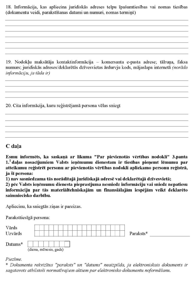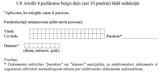 “41. Šo noteikumu 40.punktā minēto reģistrācijas iesniegumu paraksta persona, kurai ir paraksta tiesības. Ja minēto reģistrācijas iesniegumu iesniedz saskaņā ar šo noteikumu 40.1 punktu, iesniegumu paraksta persona, kurai ir paredzētas pārstāvības tiesības pēc komersanta ierakstīšanas komercreģistrā. Ja minēto reģistrācijas iesniegumu paraksta pilnvarota persona, tā vienlaikus ar šo iesniegumu iesniedz attiecīgu pilnvaru. Paraksttiesīgā persona ir atbildīga par tās sniegto ziņu patiesumu.”;