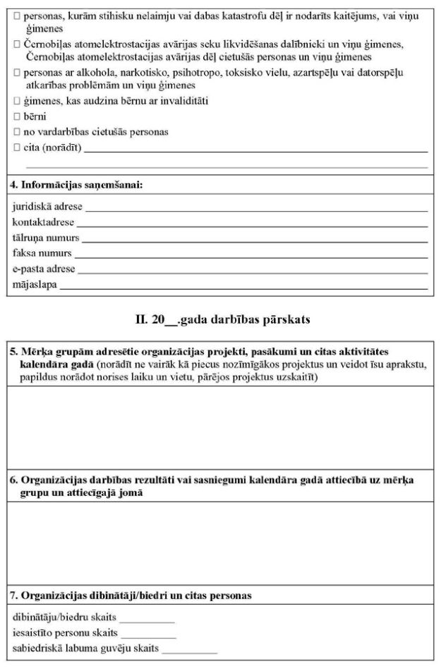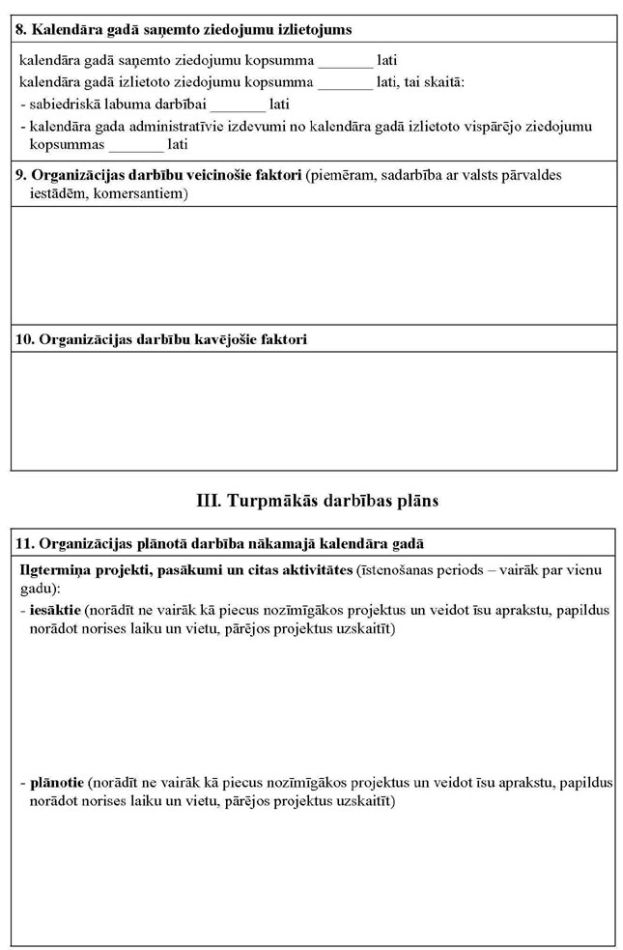 Ministru kabineta 2008. gada 22. decembra noteikumi Nr. 1110 "Noteikumi par biedrības, nodibinājuma, reliģiskās organizācijas vai tās iestādes iepriekšējā gada darbības pārskata un turpmākās darbības plāna veidlapas paraugu". Publicēts oficiālajā laikrakstā "Latvijas Vēstnesis", 30.12.2008., Nr. 202 https://www.vestnesis.lv/ta/id/185952