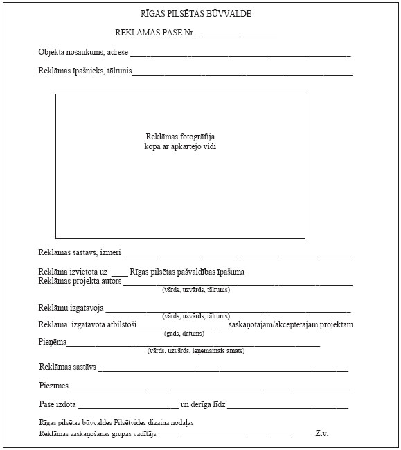 “7.3. Lai saņemtu reklāmas pasi reklāmai konstruktīvā saistībā ar būvi, Rīgas pilsētas būvvaldē jāiesniedz realizētās reklāmas fotogrāfija (10 x 15 cm), nodevas maksātāja rekvizīti (Uzņēmumu reģistra izsniegta reģistrācijas apliecības kopija, faktiskā adrese, tālruņa numurs; fiziskai personai – personas kods, adrese, tālruņa numurs, e-pasta adrese), jāuzrāda Rīgas pilsētas būvvaldē saskaņotais projekts, reklāmas izvietošanas periods, reklāmas atrašanās vieta. Ja reklāma realizēta atbilstoši saskaņotajam projektam, tiek izsniegta reklāmas pase un nosūtīts maksāšanas paziņojums par pašvaldības nodevu ar norādītu maksājumu grafiku. Reklāmas pasē tiek uzrādīti visi reklāmu veidojošie elementi.”;