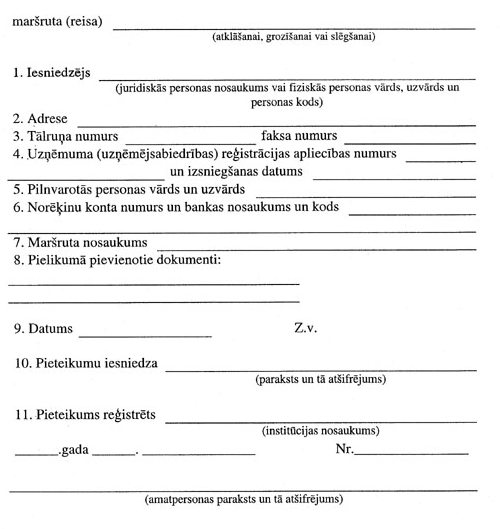 37. Priekšlikumu jauna maršruta vai reisa atklāšanai var iesniegt juridiskā vai fiziskā persona. Priekšlikums iesniedzams institūcijā pieteikuma veidā uz noteikta parauga veidlapas (1.pielikums). Jauna maršruta vai reisa atklāšanas ierosinātāja var būt arī institūcija.