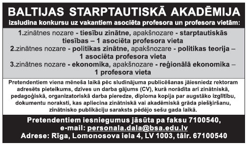 Gaidām jūsu pieteikuma vēstuli, profesionālās darbības aprakstu (CV) un izglītību apliecinoša dokumenta kopiju 20 dienu laikā no sludinājuma publicēšanas laikrakstā “Latvijas Vēstnesis”.