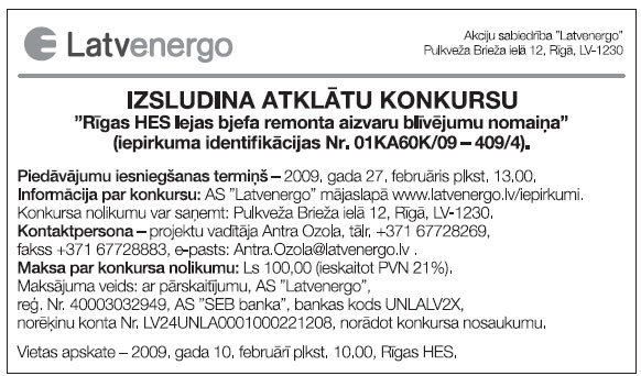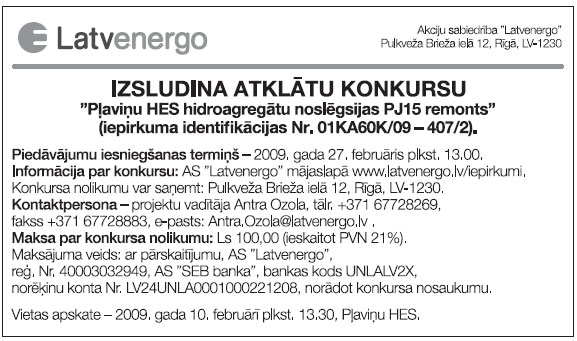 Piedāvājumu iesniegšanas pēdējais termiņš: 2009.gada 6.marts plkst. 13.00.