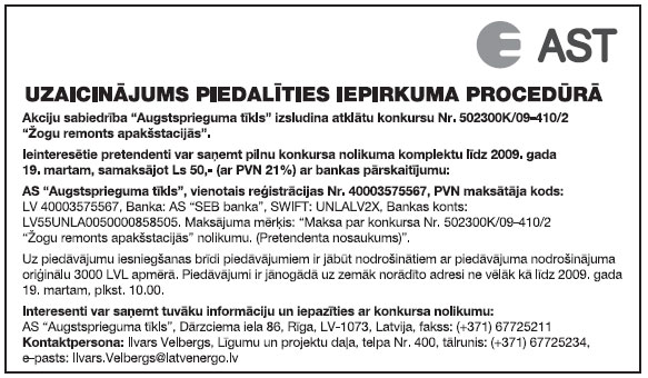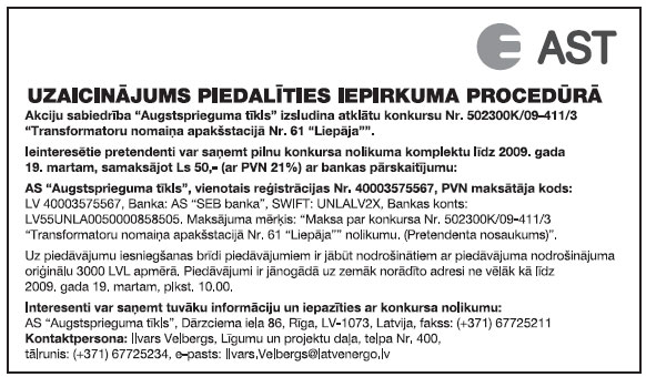 Piegādes un darbu izpildes pasūtījumi. Publicēts oficiālajā laikrakstā "Latvijas Vēstnesis", 18.02.2009., Nr. 27 https://www.vestnesis.lv/ta/id/187911