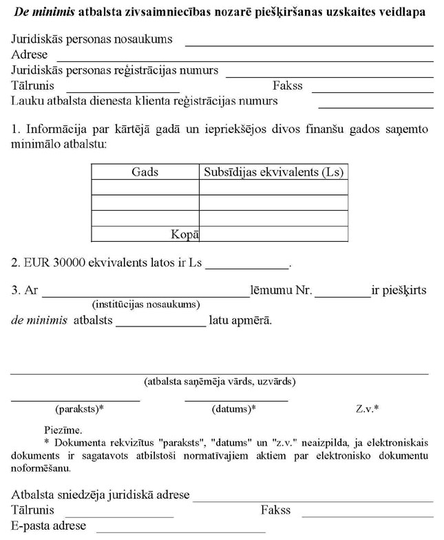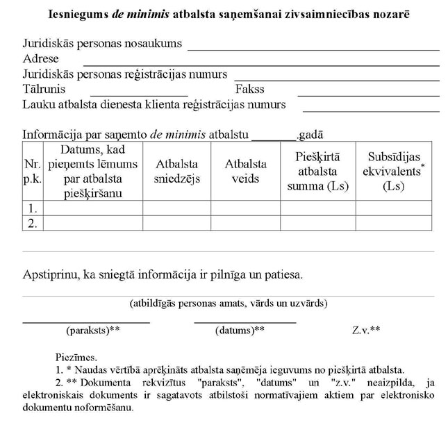 2. Lai saņemtu de minimis atbalstu, atbalsta pretendents iesniedz atbalsta sniedzējam iesniegumu de minimis atbalsta saņemšanai (1.pielikums). Iesniegumā norāda informāciju par kārtējā gadā un iepriekšējos divos finanšu gados saņemto de minimis atbalstu neatkarīgi no atbalsta veida vai atbalsta sniedzēja.
