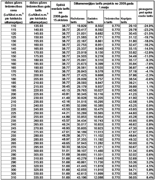 tarifu projektu, kas aprēķināts atbilstoši tālāk tabulā norādītajām dabasgāzes cenām