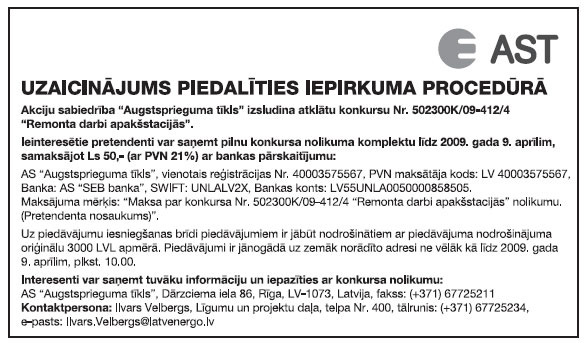 Nolikumu un tā grozījumu var saņemt no paziņojuma par iepirkuma procedūru publicēšanas līdz 13.04.2009. plkst. 9.00 |