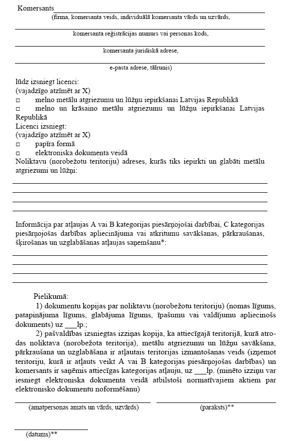 “12. Lai saņemtu licenci, komersants papīra formā vai elektroniska dokumenta veidā atbilstoši normatīvajiem aktiem par elektronisko dokumentu noformēšanu iesniedz licencēšanas komisijai iesniegumu par licences izsniegšanu (1.pielikums) un šādus dokumentus: