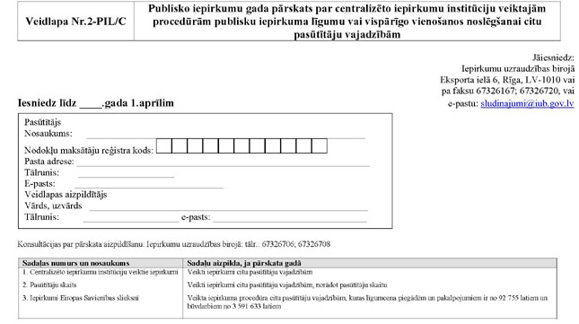2.2. veidlapa Nr.2-PIL/C “Publisko iepirkumu gada pārskats par centralizēto iepirkumu institūciju veiktajām procedūrām publisku iepirkuma līgumu vai vispārīgo vienošanos noslēgšanai citu pasūtītāju vajadzībām” (turpmāk – veidlapa Nr.2-PIL/C) (2.pielikums).