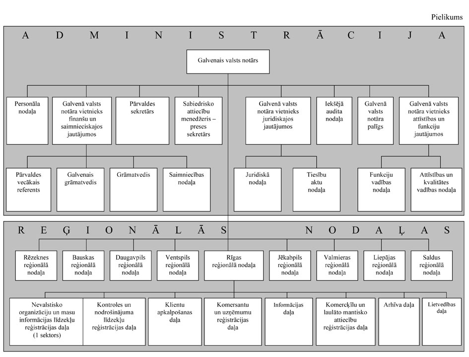 10. Reģistrā ir struktūrvienības, kas tieši pilda reģistra funkcijas, un administrācija, kas veic iestādes darbības plānošanu, metodisko vadību un nodrošina kontroli un uzraudzību pār funkcionālo struktūrvienību darbību un sniedz administratīvo, tehnisko un juridisko atbalstu (pielikums).