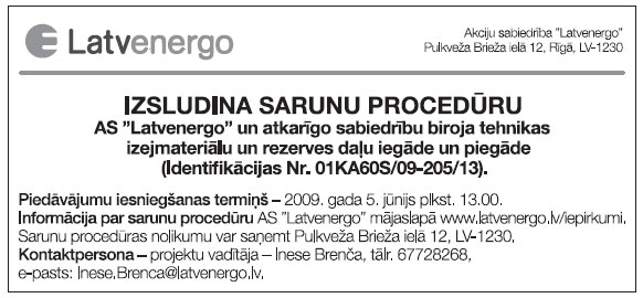 Piegādes un darbu izpildes pasūtījumi. Publicēts oficiālajā laikrakstā "Latvijas Vēstnesis", 7.05.2009., Nr. 70 https://www.vestnesis.lv/ta/id/191523