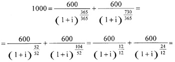 Tiek aizdoti Ls 1000. Kredīts tiek atmaksāts divos maksājumos, katrs pa Ls 600, attiecīgi pēc gada un pēc diviem gadiem.