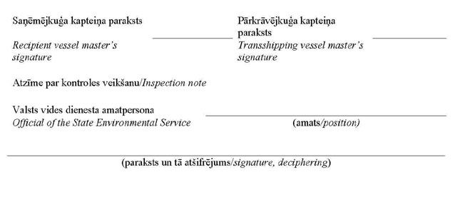 3. Kuģa kapteinis pēc nozvejoto zivju izkraušanas ne vēlāk kā 48 stundu laikā saskaņā ar normatīvajiem aktiem par rūpniecisko zveju iesniedz Valsts vides dienestā zvejas žurnālu un tajā ietverto zivju izkraušanas deklarāciju, bet tā kuģa kapteinis, uz kura kuģa jūrā ir pārkrautas zivis, papildus zvejas žurnālam ne vēlāk kā 48 stundu laikā pēc izkraušanas pabeigšanas iesniedz pārskatu par zivju pārkraušanu vai pieņemšanu jūrā (1.pielikums) un zvejas žurnāla ailē “Zvejas vieta” ieraksta “Skatīt pārskatu pielikumā”.