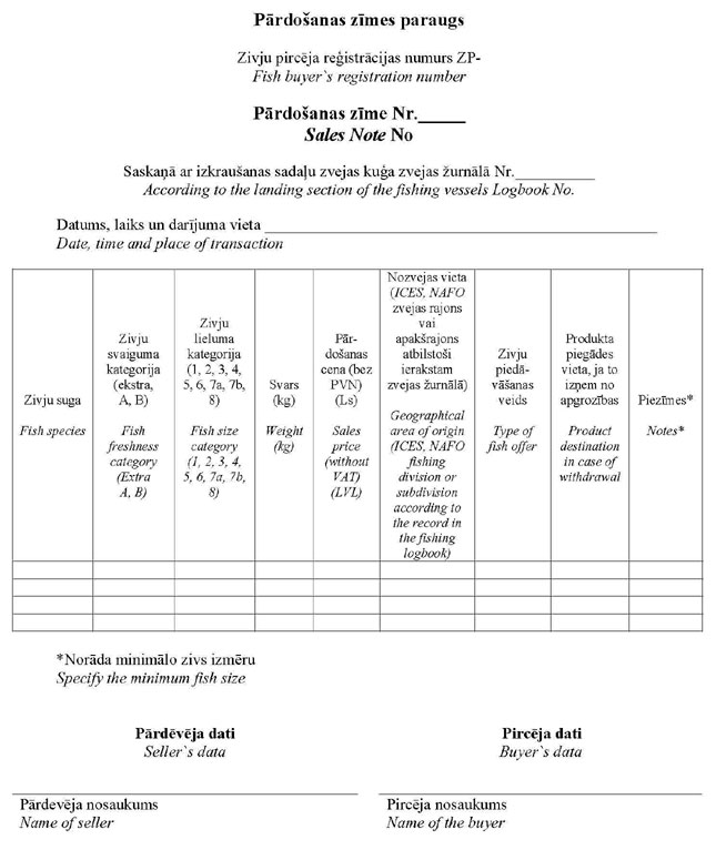 10. Pēc zivju pirmās pirkšanas darījuma (arī darījuma, kas notiek pēc zivju transportēšanas no to izkraušanas vietas uz citu zivju pirmās pirkšanas vietu) Latvijas Zivju resursu aģentūrā reģistrētie zivju pircēji atbilstoši Padomes 1995.gada 12.oktobra Regulas (EEK) Nr.2847/93, ar kuru izveido kontroles sistēmu, kas piemērojama kopējai zivsaimniecības politikai, 5.pantā noteiktajām prasībām iesniedz Valsts vides dienestā pārdošanas zīmi (4.pielikums) vai, izmantojot zivju pircēja reģistrācijas laikā piešķirto lietotāja identifikatoru, ievada pārdošanas zīmes datus informācijas sistēmā. Aizpildot pārdošanas zīmi vai ievadot attiecīgos datus informācijas sistēmā, zivju pirmās pirkšanas darījumus numurē secīgā kārtībā, izmantojot Latvijas Zivju resursu aģentūras piešķirtos unikālos zivju pirmās pirkšanas darījuma reģistrācijas numurus.