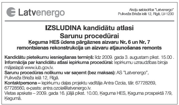 Konkursa piedāvājumu atvēršana notiks 2009. gada 15.jūlijā plkst.10.20, Rīgā, Gogoļa ielā 3, 227. kabinetā.