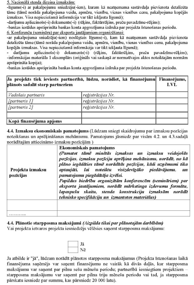 25.7. nacionālā stenda dizaina izstrādes un elementu izmaksas līdz 5 000 latu vienam projekta iesniedzējam visās atlases kārtās. Nacionālais stends ir stends, kurā ir Latvijas nacionālā simbolika, valsts nosaukums un informācija par valsti (brošūras, bukleti). Nacionālo stendu organizē biedrība, kuras Latvijā reģistrēto biedru (komersantu) kopējais apgrozījums iepriekšējā gadā ir pārsniedzis 50 milj. latu (tiek ņemts vērā arī to komersantu apgrozījums, kas nav projekta iesniedzēja biedri, bet ir biedri kādā no organizācijām, kas ir projekta iesniedzēja biedri) un kura ir dibināta ne vēlāk kā trīs gadus pirms projekta iesnieguma iesniegšanas.