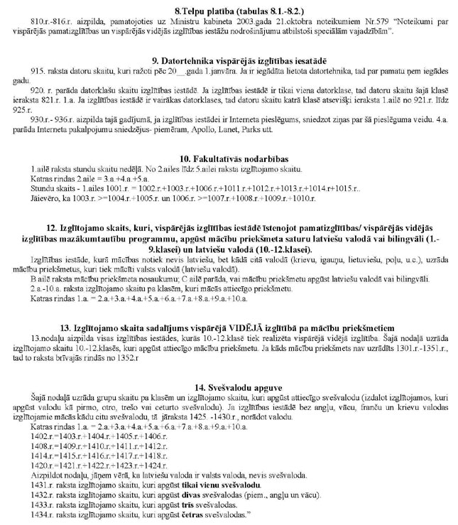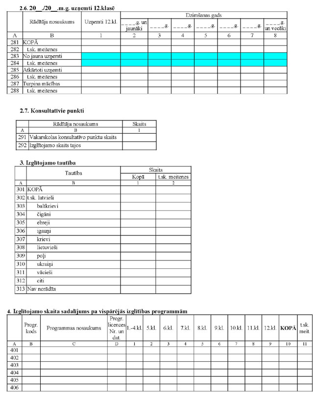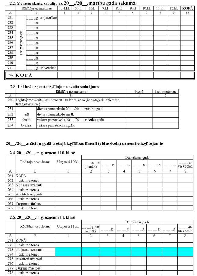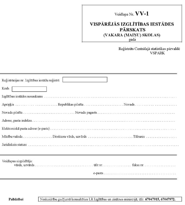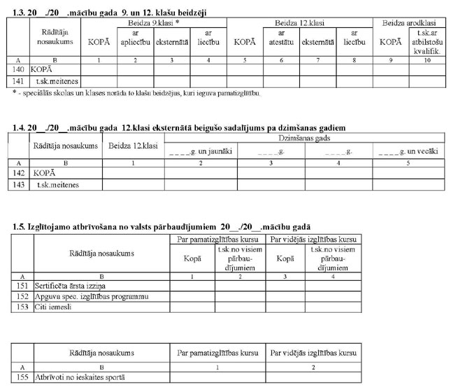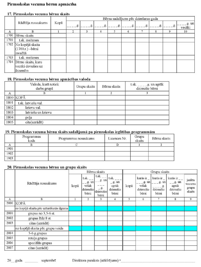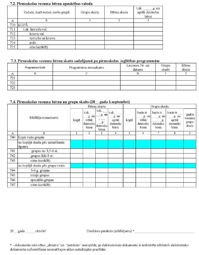 “3.3. Pirmsskolas izglītības iestādes pārskatu (VSP-1) – katru gadu ne vēlāk kā 20.septembrī divos eksemplāros pašvaldībā, privātās pirmsskolas izglītības iestādes – Izglītības un zinātnes ministrijā. Pašvaldības līdz 27.septembrim iesniedz datus Izglītības un zinātnes ministrijā. Izglītības un zinātnes ministrija līdz 28.decembrim iesniedz kopsavilkumu Centrālajā statistikas pārvaldē.”