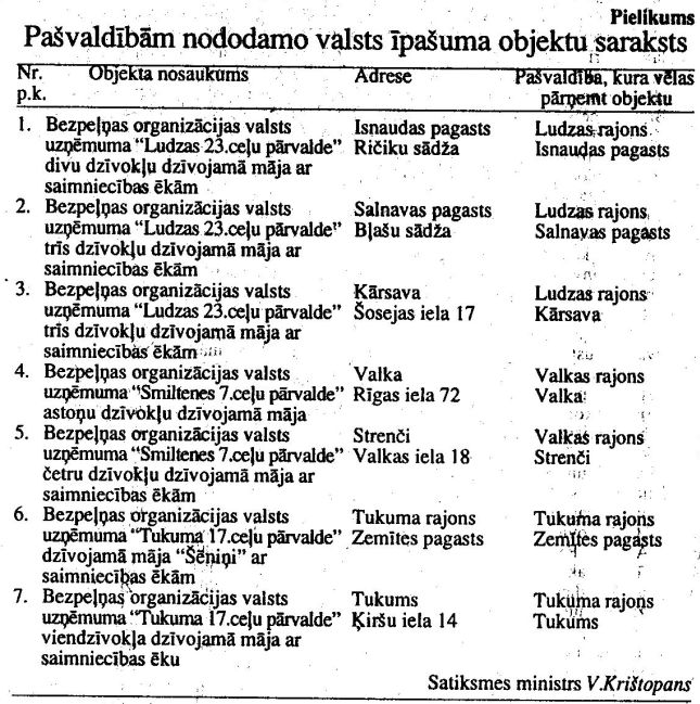 Saskaņā ar likuma "Par valsts uzņēmumu" (Latvijas Republikas Augstākās Padomes un Valdības Ziņotājs, 1991, 1., 13./14.nr.; 1992, 29./30.nr.; 1993, 22./23.nr.; Latvijas Vēstnesis, 1994, 96.nr.; 1995, 162.nr.; 1996, 94.nr.) 11.pantu un likuma "Par valsts un pašvaldību dzīvojamo māju privatizāciju" (Latvijas Vēstnesis, 1995, 103.nr.; 1996, 64.nr.) Pārejas noteikumu 2.punktu, kā arī ievērojot Satiksmes ministrijas un pašvaldību savstarpējo vienošanos, atļaut Satiksmes ministrijai - valsts īpašuma pārvaldītājai - nodot attiecīgo pašvaldību īpašumā valsts īpašuma objektus (pielikums).