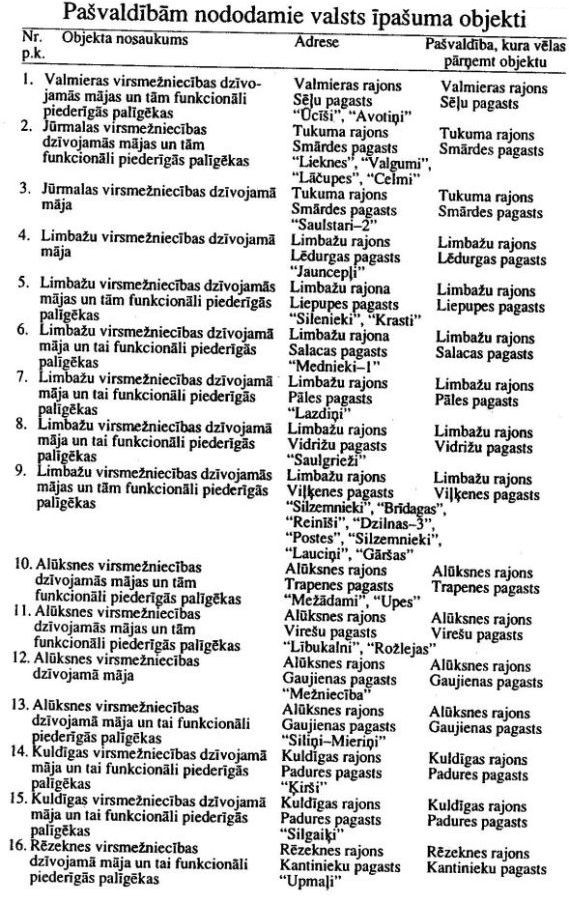 Saskaņā ar likuma "Par valsts un pašvaldību dzīvojamo māju privatizāciju" (Latvijas Vēstnesis, 1995, 103.nr.; 1996, 64.nr.) Pārejas noteikumu 2.punktu un likuma "Par dzīvokļa īpašumu" (Latvijas Vēstnesis, 1995, 157.nr.; 1996, 64.nr.) 25.pantu, kā arī ievērojot Valsts meža dienesta un pašvaldību savstarpējo vienošanos, Valsts meža dienestam - valsts īpašuma valdītājam - nodot attiecīgo pašvaldību īpašumā tālākai privatizācijai valsts īpašuma objektus (pielikums).