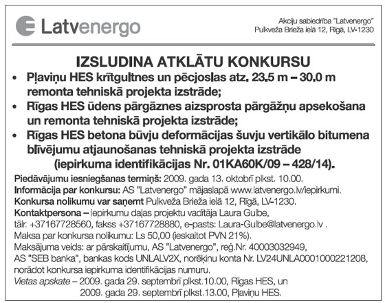 Piedāvājumu iesniegšanas termiņš: 2009.gada 28.septembris plkst.12.