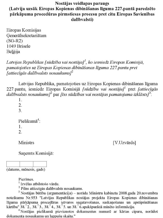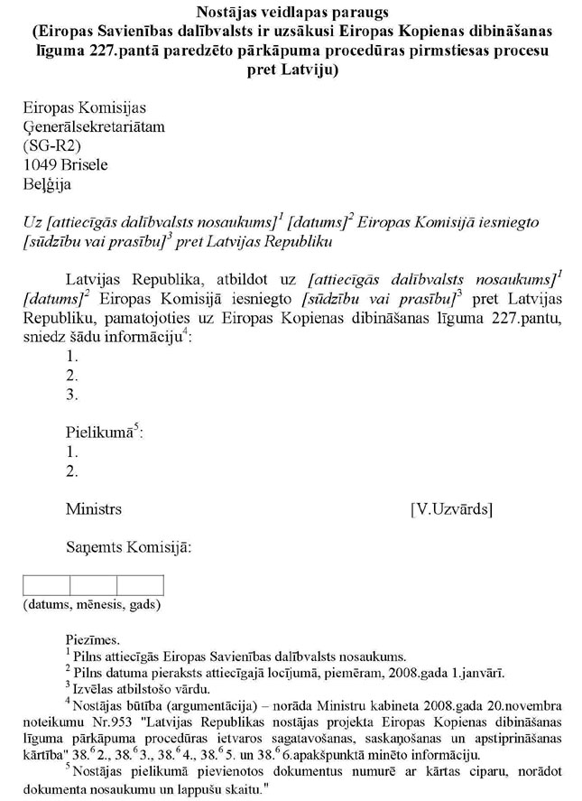 38.6 Ja līguma 227.pantā paredzētā procedūra uzsākta pret Latviju, nostājas projektu noformē atbilstoši šo noteikumu 2.pielikumā norādītajam nostājas veidlapas paraugam. Veidlapā norāda: